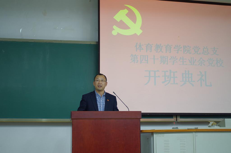 2016年11月7日下午,体育教育学院党总支第40期业余党校在教学楼211教室召开开班典礼,校党委组织部部长孙旭东,体育教育学院党总支书记江志强、思想政治教研部牟向东老师以及全体辅导员老师参加了开班典礼。