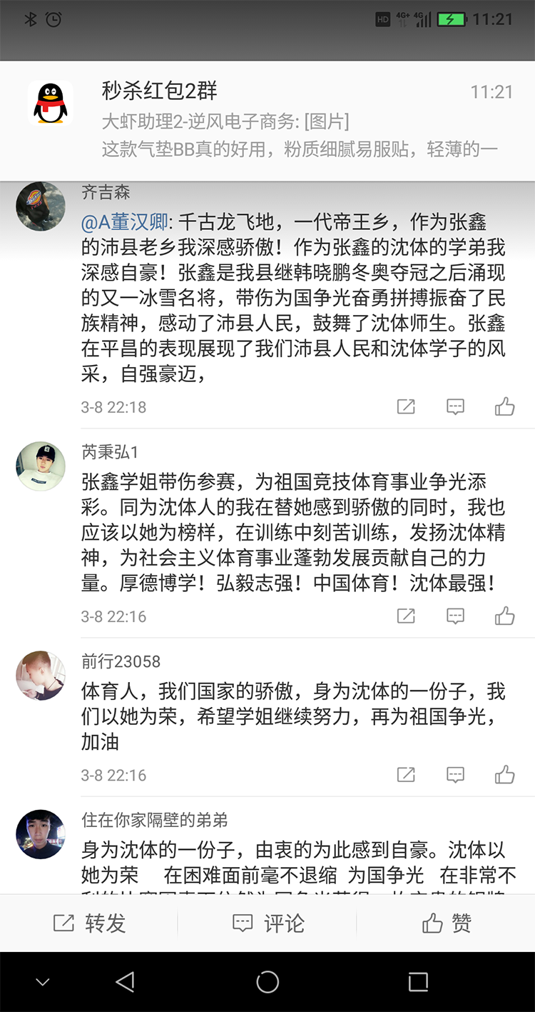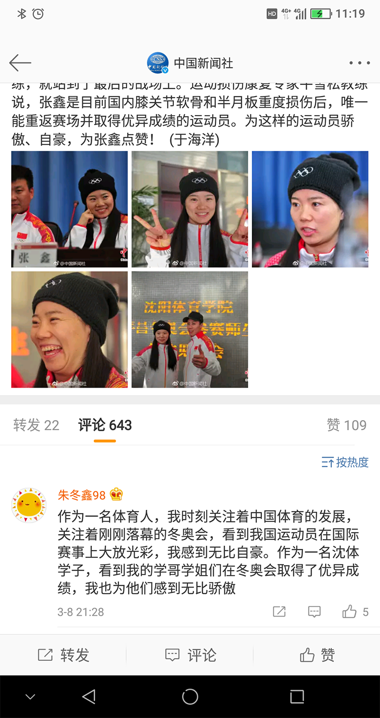 在本届冬奥会上我院自主培养的自由式滑雪空中技巧女子运动员张鑫等人带伤参战,为国争光。本月3日,新华社发表了《为绑着冰袋夺得冬奥会银牌的张鑫点赞》一文,讲述了运动员张鑫带伤参加比赛的感情经历。体育教育学院团委号召学院全体青年学生向张鑫等运动员学习,为她们点赞。