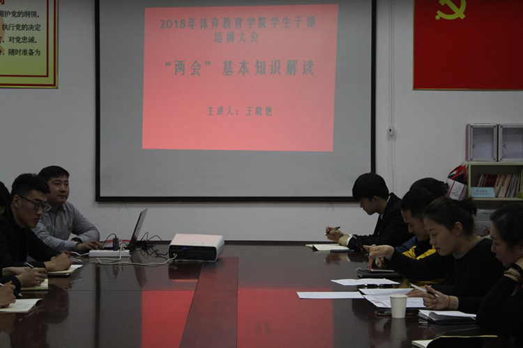 2018年3月12日,体育教育学院团委举行学院学生干部培训大会,体育教育学院团委书记姜少英同志、体育教育学院全体辅导员和全体学生干部参加了本次活动。体育教育学院党总支副书记王晓艳同志为学生干部做了《两会基础知识解读》的培训讲座。
