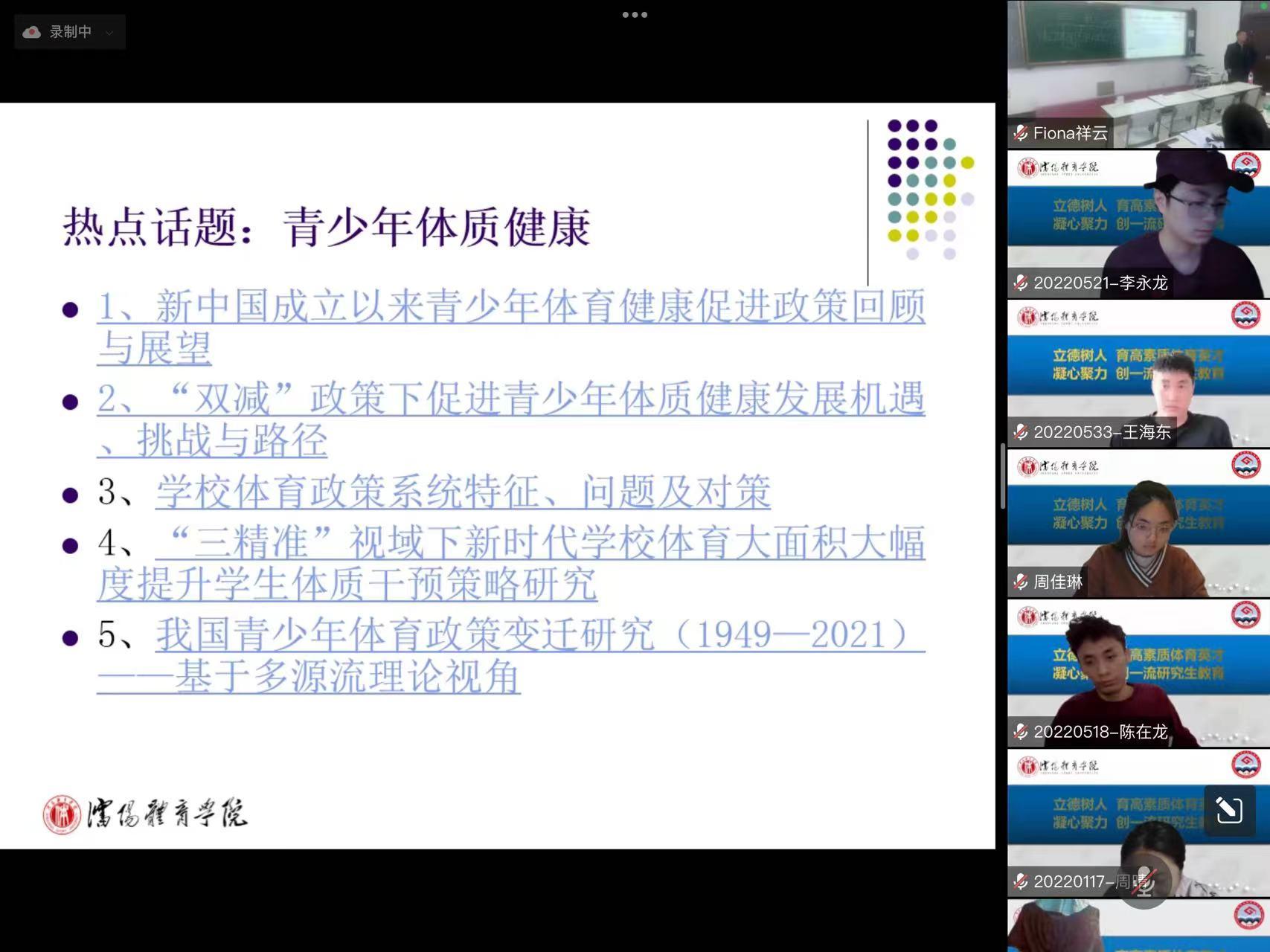 10月19日下午,体育教育学院第二十九期研究生学术论坛活动在103教室举行,未返校学生以腾讯会议的方式同步学习。程文广教授做了《关于研究生学位论文选题、开题与撰写》的专题讲座,讲座由副院长甘荔桔主持,2022级研究生和部分青年教师参加了会议。