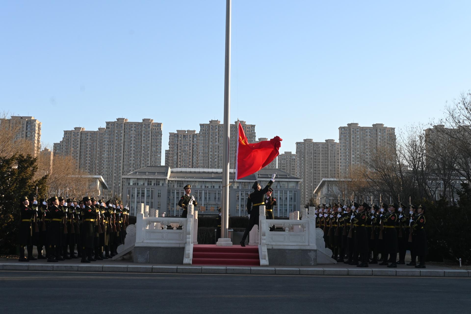 仪式在《义勇军进行曲》中庄严拉开帷幕,大学生国旗护卫队迈着铿锵有力、整齐划一的步伐护送国旗入场,全体师生肃立注目、高唱国歌,鲜艳的五星红旗冉冉升起,迎风飘扬。