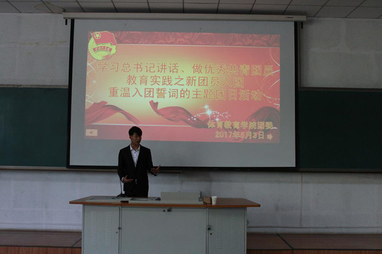 活动第一项,接收韦阳进等11名学生为共青团员,在宣读了团支部决议后,学院参会的领导老师为这11名新团员颁发了团员证及佩戴团徽,并面对团旗进行了庄严的宣誓。新团员韦阳进代表所有新团员表示一定将入团誓词铭记于心并转化为实际行动,坚定理想信念,脚踏实地,奋勇争先,勇于实践,充分发挥团员青年的先锋模范作用,为“中国梦”的实现贡献自己的智慧和力量。“我志愿加入中国共产主义青年团,坚决拥护中国共产党的领导,遵守团的章程……”活动第二项,面对鲜红的团旗,全体参加活动的领导老师和青年团员举起右手,在团员代表的带领下庄严宣誓,重温入团誓词。最后,本次活动在洪亮的《光荣啊,中国共青团》团歌中结束。体育教育专业2016级16班国赟在活动结束后表达了自己的内心感受,这是思想的洗礼和心灵的震撼,感觉又回到了当初入团的那一刻,现在更加深切地感受到了作为共青团员的一份沉甸甸的责任。