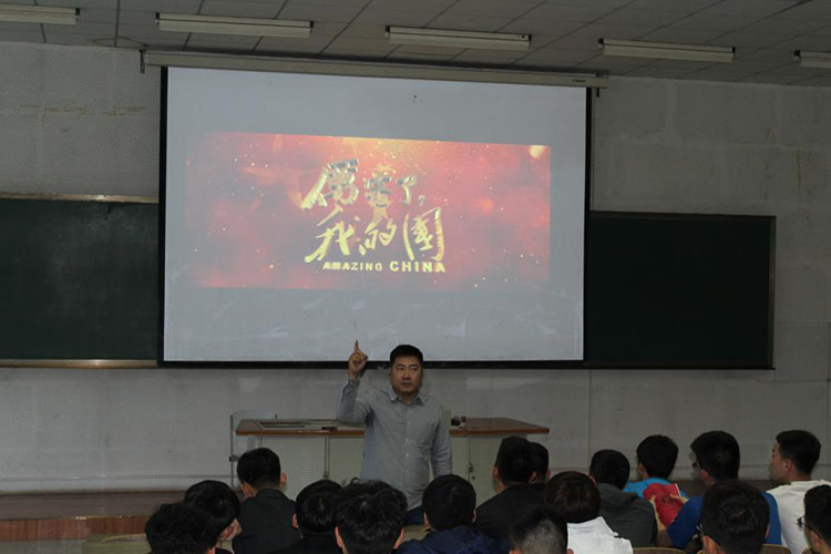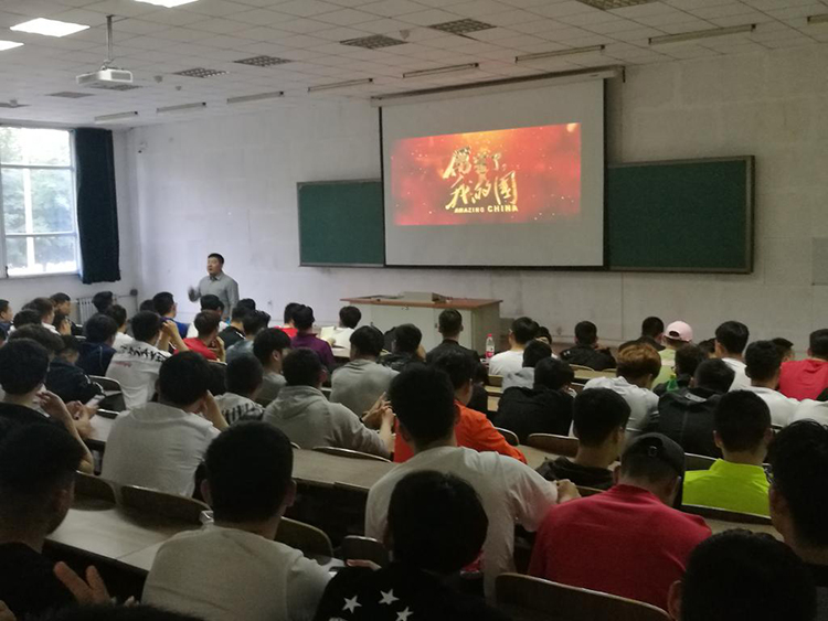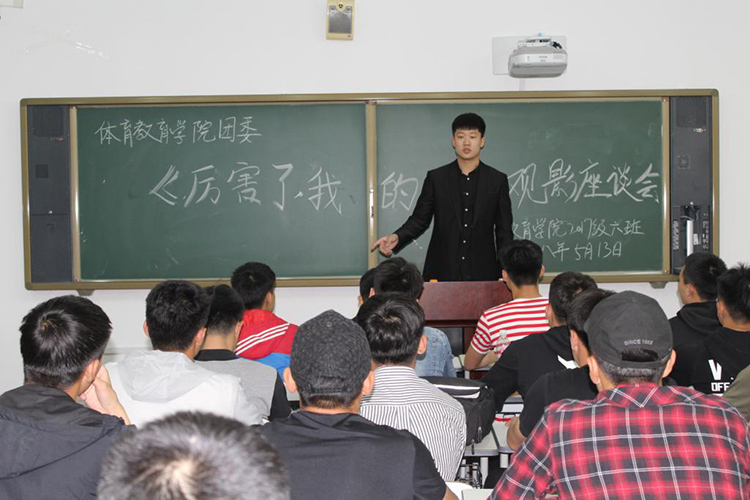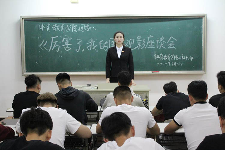 2018年5月13日,体育教育学院组织学生观看大型纪录电影《厉害了,我的国》并召开学生代表座谈会,体育教育学院团委书记姜少英老师与学生一同观看,体育教育学院300余名学生在教学楼112教室观看了电影。